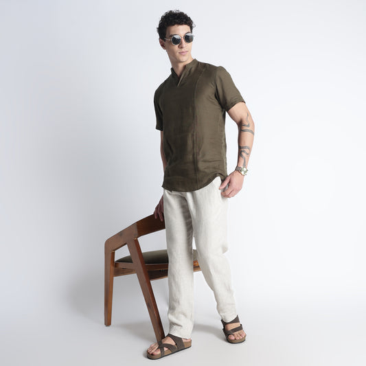 Mens linen-woven T-shirt - DARK OLIVE - 129